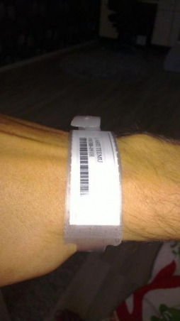 Kuvassa muistivammaisen ranneke. Jos löydätte tälläisen ukon palloilemassa kysymysmerkkinä, palauttakaa se kotiin :D
